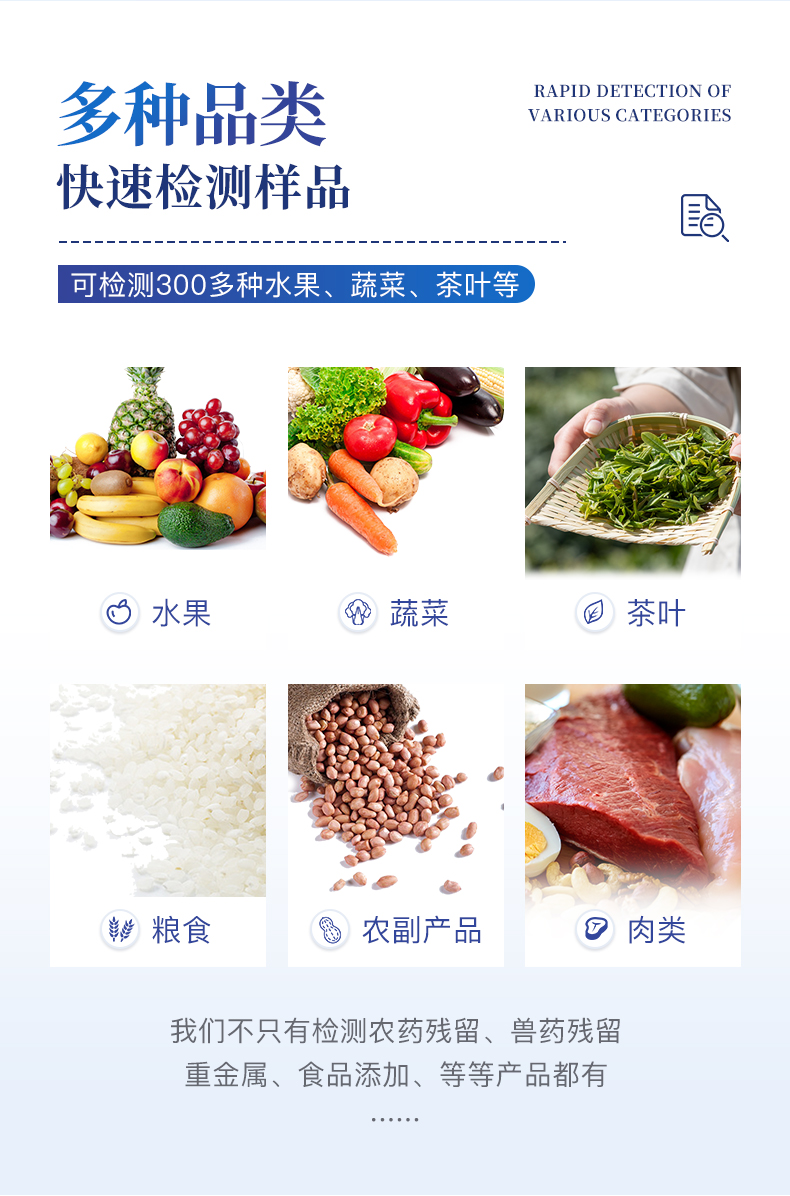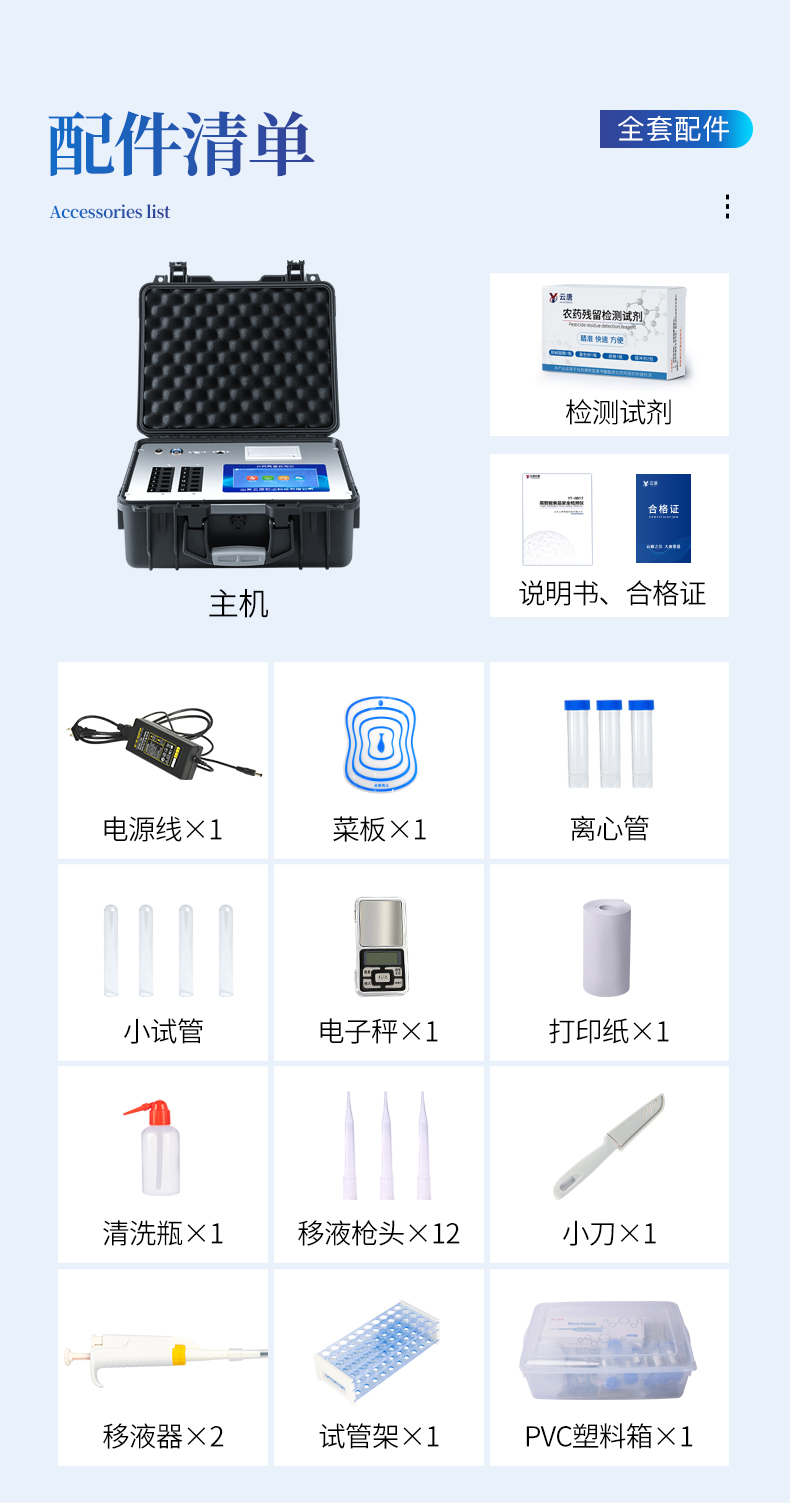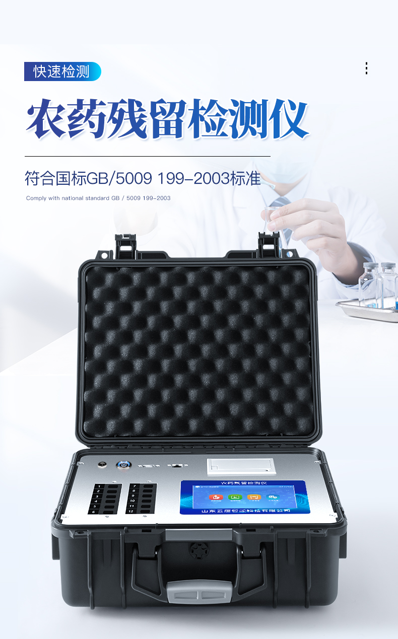 综合农药残留检测仪,除了遵循国标对有机磷和氨基甲酸酯类农药进行检测外,还可以针对具体农药进行分项准确检测,包含吡虫啉、噻虫嗪、多菌灵、百菌清、克百威、毒死蜱、异丙威、啶虫脒、氟虫腈、水胺硫磷、甲萘威、三唑磷、百草枯、甲霜灵、杀螟硫磷、百菌清-多菌灵2合1、氟虫腈-甲萘威2合1、甲基对硫磷、乙草胺、阿维菌素、有机磷、甲草胺、涕灭威、噻菌灵、三唑酮、氯吡脲、多效唑、氯噻啉、霜霉威、噻虫啉、辛硫磷、苯醚甲环唑、4-氯苯氧乙酸、2,4-二氯苯氧乙酸、2,4,5-三氯苯氧乙酸、6-苄基腺嘌呤、除草定、烯啶虫胺、异菌脲、氟苯脲、腐霉利、甲氰菊酯、**氯氟氰菊酯、二甲戊灵、氟节甲基异柳磷、哒螨灵、噻虫胺、烯酰吗啉、嘧菌酯、氟乐灵、嘧霉胺、三唑酮/三唑醇、灭蝇胺、戊唑醇、甲拌磷、氯虫苯甲酰胺、二嗪磷、氧乐果、甲基吡啶磷、阿灭丁、双甲脒等众多杀虫剂化合物。