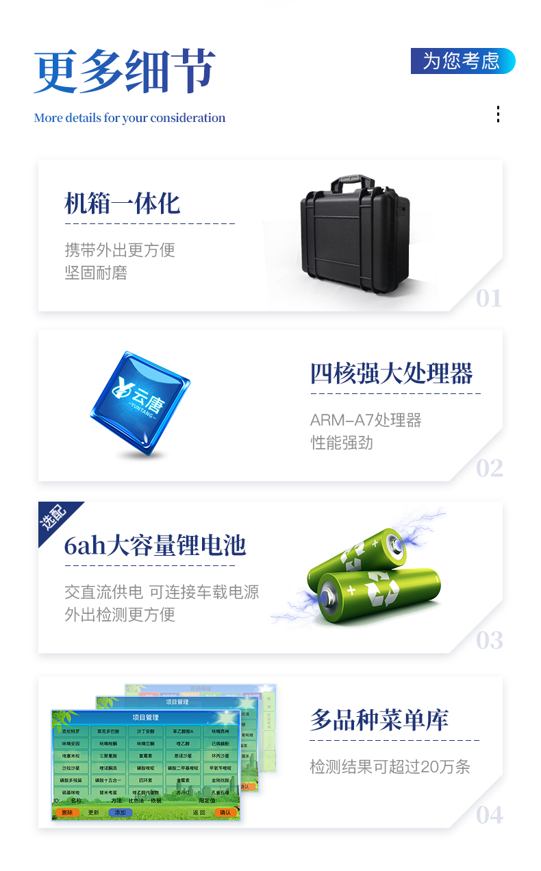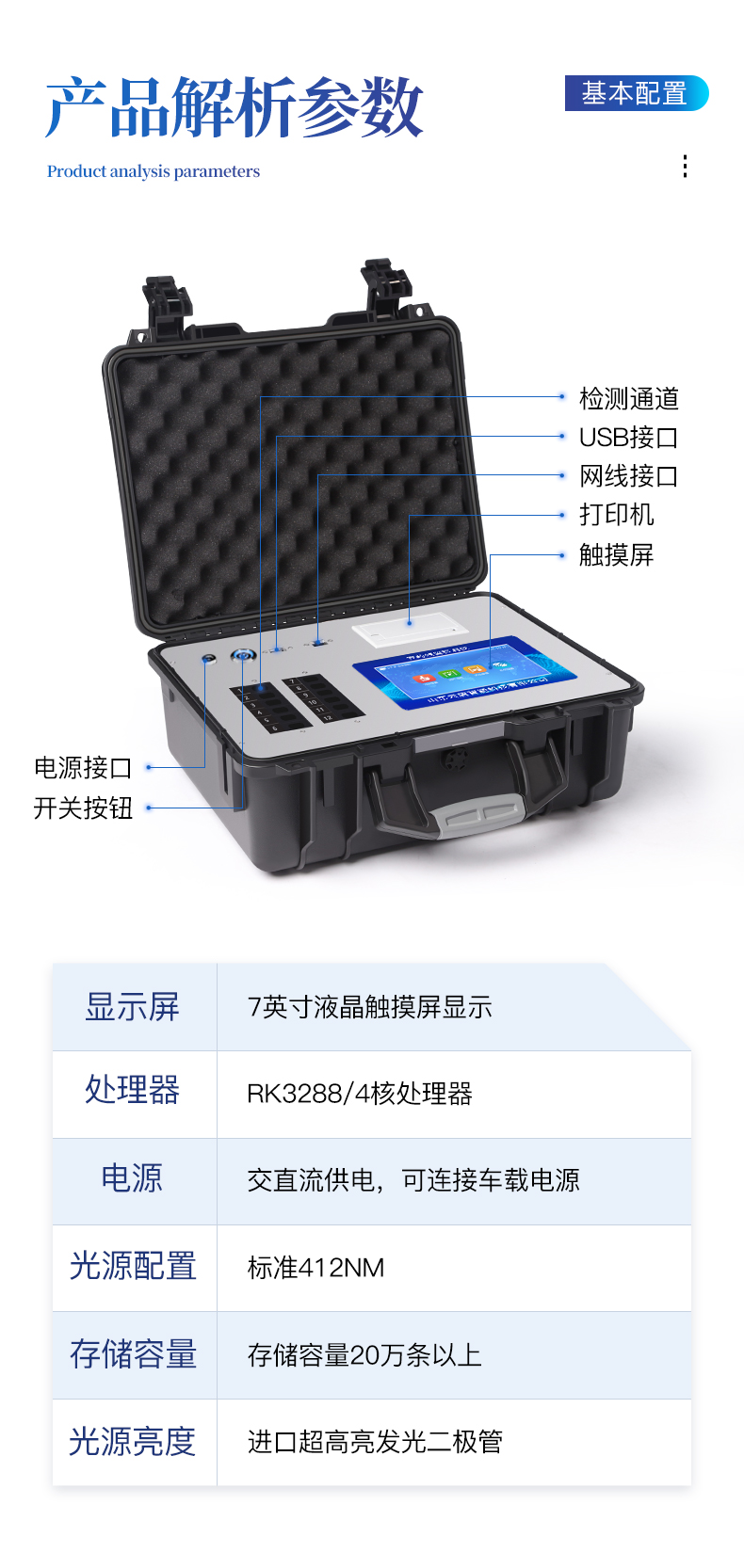 | 主控芯片采用ARM Cortex-A7,RK3288/4核处理器,主频1.88Ghz,运转速度更快速,稳定性更强。 | 12个检测通道,可批量快速多样品检测, | 显示方式:7英寸液晶触摸屏显示,人性化中文操作界面,读数直观、简单。 | 交直流两用,配有6ah大容量充电锂电池,方便户外流动测试,直流12V供电,可连接车载电源。 | 智能恒流稳压,光强自动调节与校准,长时间连续工作光源无温漂现象。 | 样本编号自动累加。 | 数据无线上传平台,并可从平台导出为Excel表格。 | 检测结果存储容量20万条 | 同时支持U盘拷贝,标准USB接口,免驱动插拔。 | 检测项目可扩充,固件可升级 | 仪器尺寸:43×35×19cm, 主机净重:5.2kg |