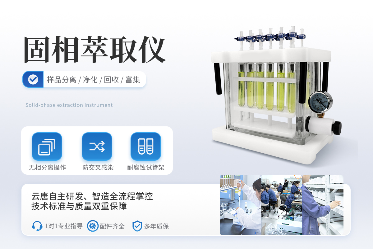 固相萃取仪是由液固萃取和液相色谱技术相结合发展而来,利用固体吸附剂将液体样品中的目标化合物吸附,与样品的基体和干扰化合物分离,然后再用洗脱液洗脱或加热解吸附,达到分离和富集目标化合物的目的(即样品的分离,净化和富集),目的在于降低样品基质干扰,提高检测灵敏度,其应用于各类食品安全检测、农产品残留监控、医药卫生、环境?;?、商品检验、自来水及化工生产实验室。