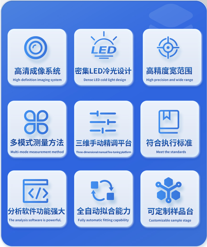 | 1.高精度与宽范围测量能力,支持接触角测量与表界面张力测量。 | 2.多功能分析模块与算法,多模式测量方法;表面能与润湿性分析。 | 3.采用密集LED冷光设计,发光均匀,图像清洗,寿命长; | 4.样品台采用三维手动精调平台,操作灵活,定位准确,样品台可根据实际样品尺寸定制; | 5.高清成像系统:高清工业相机,连续变倍远心镜头,拍摄稳定,图像清晰; | 6.分析软件功能强大:具备一键式全自动拟合能力、拟合方法,满足各种液滴形态的**拟合; | 7.数据库管理功能:统一存储管理接触角、表面张力、表面自由能等历史测量数据,断电数据不丢失,支持随时查看、加载数据进行分析对比,亦可再次导出数据。 |