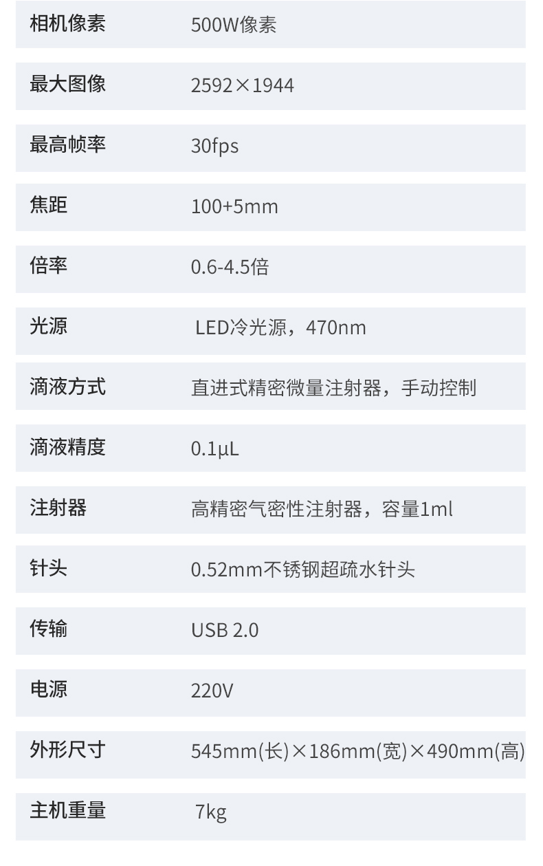 | 滴液方式 | 直进式精密微量注射器,手动控制 | |