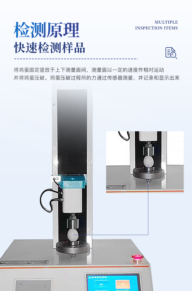 | 1、采用芯片控制,高精度测力传感器,精度高。 | 2、采用高性能步进电机,精密滚珠丝杆传动,保证该仪器传动精准。 | 3、大触摸屏中文显示,友好人机界面操作。全自动完成测试。操作方便,具有测试数据统计处理功能,微型打印机输出。 | 4、随机配备蛋壳竖立固定装置,方便快速测量。 |