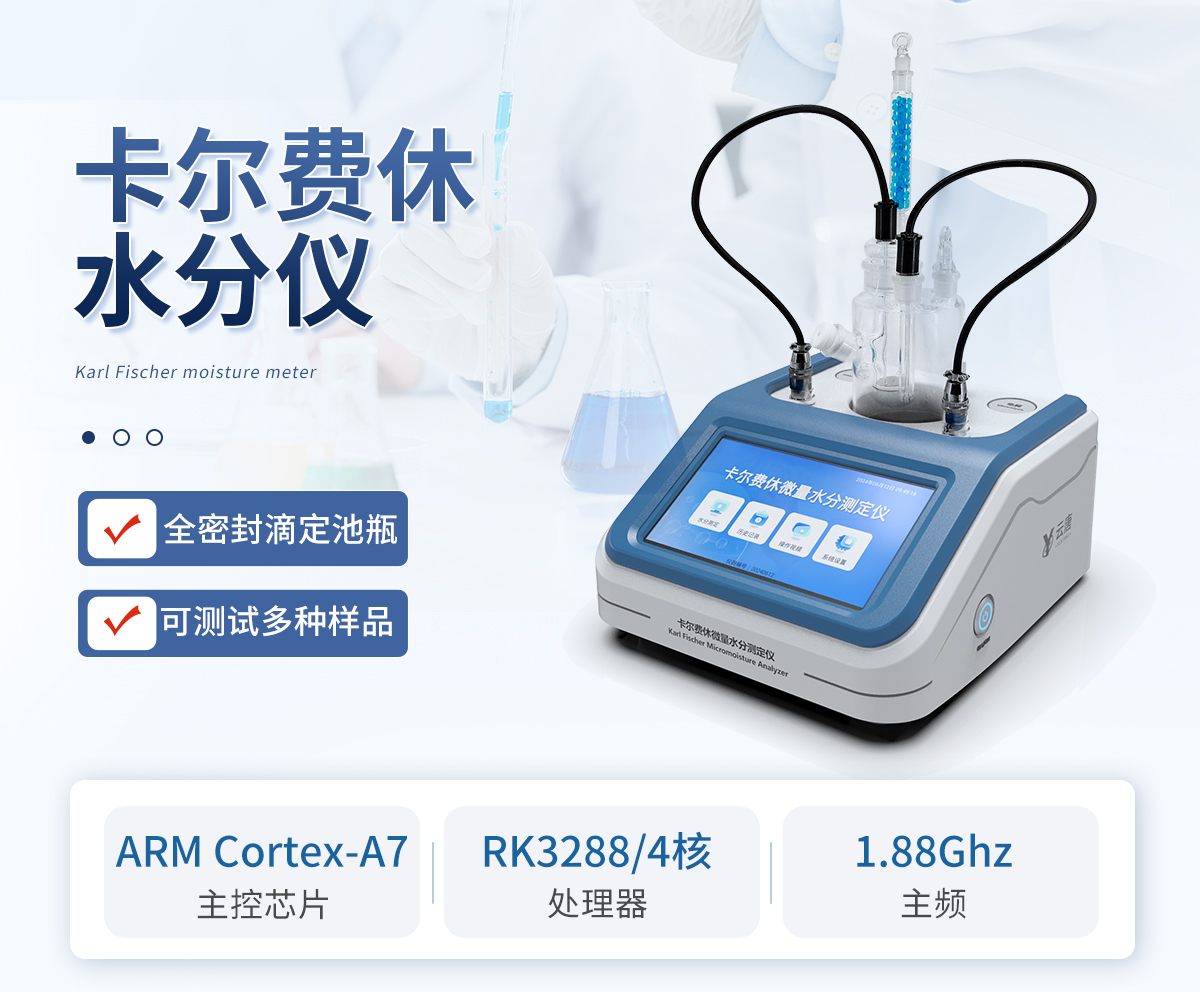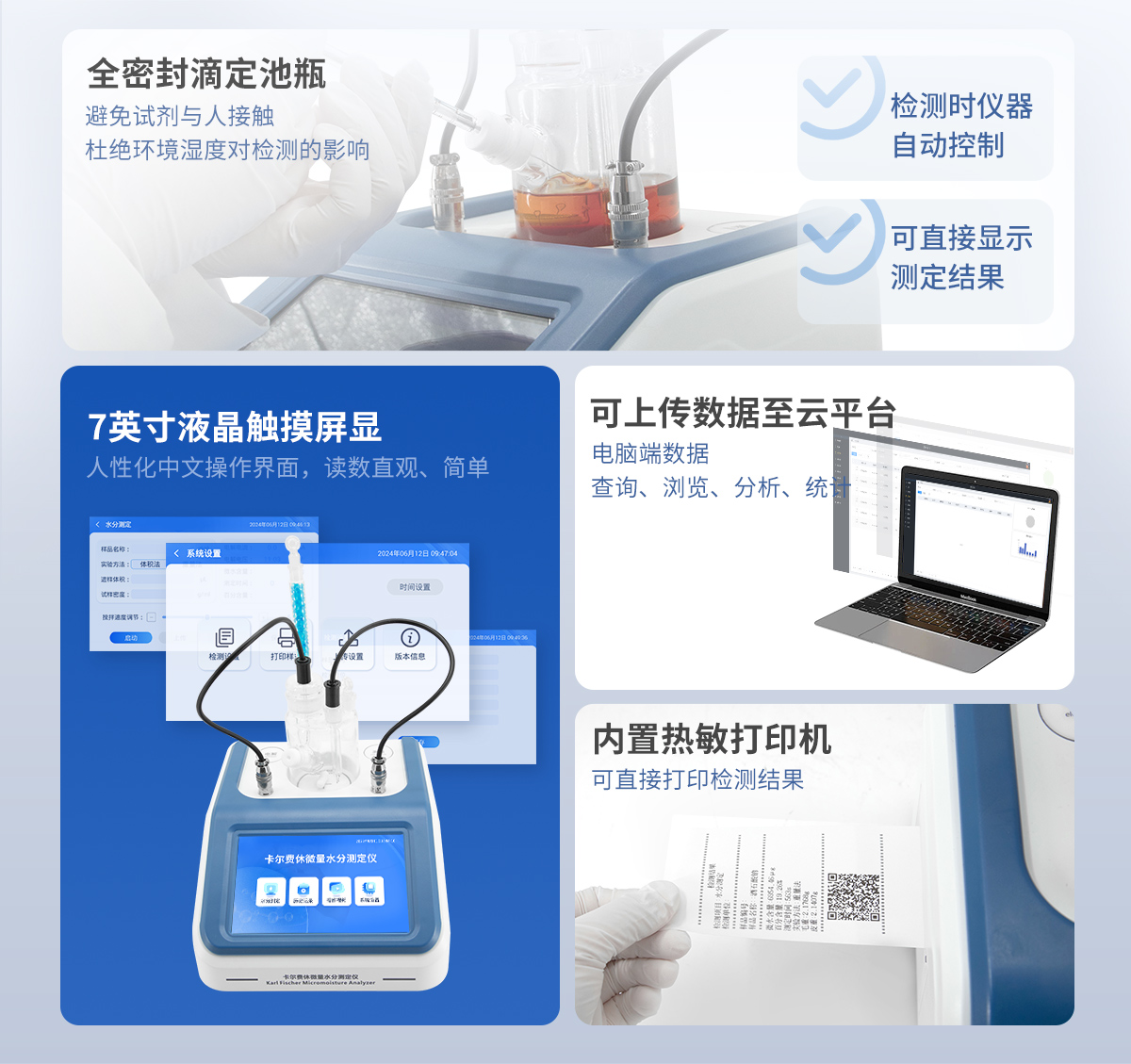 | 1.采用全新安卓系统,配置7英寸液晶触摸屏显示,人性化中文操作界面,读数直观、简单。 | 2.仪器主控芯片为ARM Cortex-A7,RK3288/4核处理器,主频1.88Ghz,运转速度更快速,稳定性更强显示方式: | 3.检测采用全密封滴定池瓶,避免试剂与人接触,杜绝环境湿度对检测的影响;检测过程中仪器自动控制,搅拌、测定60秒左右完成,可直接显示测定结果,无需人员频繁操作。 | 4.仪器内置操作视频,可直接观看学习操作方法。 | 5.仪器可以测试多种样品,循环检测,即放即检。 | 6.仪器可对样品信息自由编辑,包括:样品名称、样品编号、检测单位、检测人员、联系方式、受检单位等。 | 7.仪器可对检测样品测定信息进行设置,例如:电解电流、电解电压、微量水分含量、测定时间、百分含量、进样体积、试样密度、毛重和皮重等。 | 8.水分检测方式可根据实际需求选择体积法或重量法。 | 9.内置热敏打印机,可直接打印检测结果,并可根据需求灵活设置打印内容(二维码,样品编号、检测单位、检测人员、联系电话、受检单位、检测日期等)。 | 10.样品检测结果可通过二维码扫码查看。 | 11.检测数据可通过历史记录进行检索,通过设置检测日期、样品编号、检测单位、检测人员、样品名称、受检单位等信息查找对应数据。 | 12.仪器配备标准USB接口,免驱动安装。检测结果存储容量20万条以上,可生成Excel表格进行拷贝。 | 13.仪器配备WiFi通信??椋缮洗葜猎破教?,实现电脑端数据查询、浏览、分析、统计等。 | 14.仪器可定向远程更新,进行升级维护,无需返厂更新,节省时间及人力成本,避免了物流运输导致设备损坏的潜在风险。 |