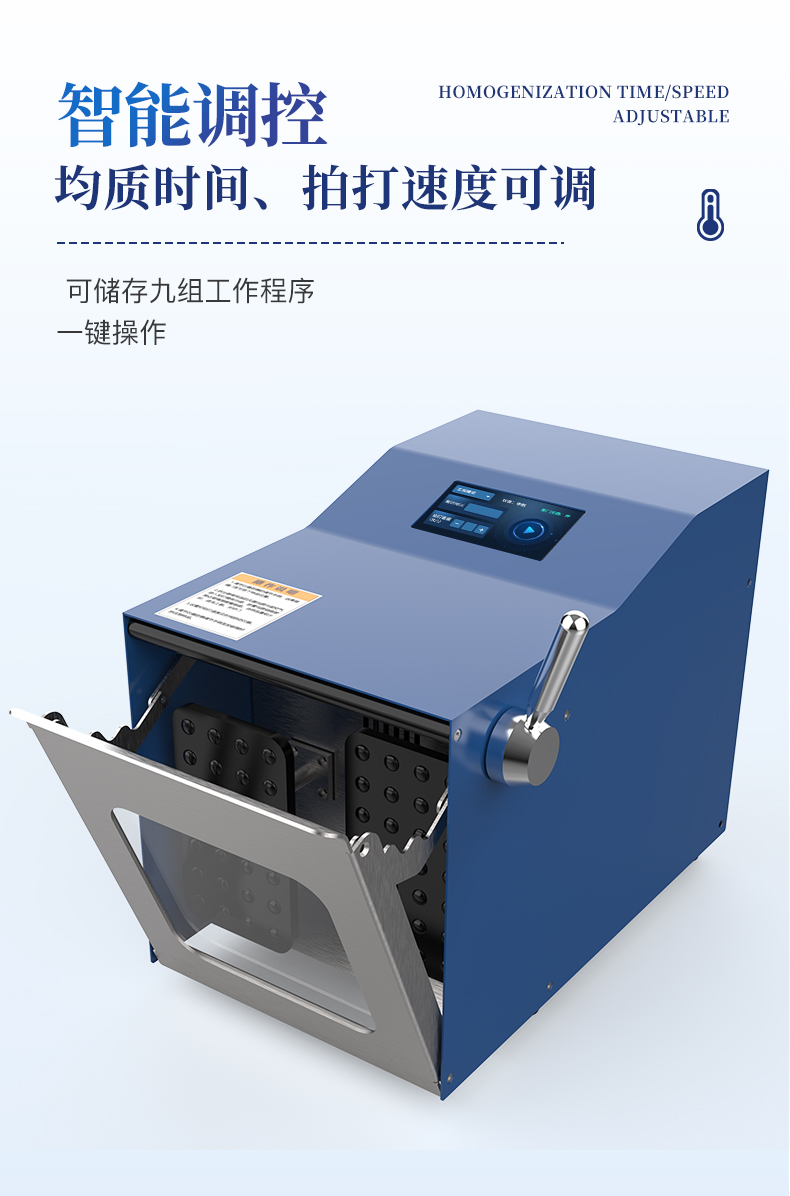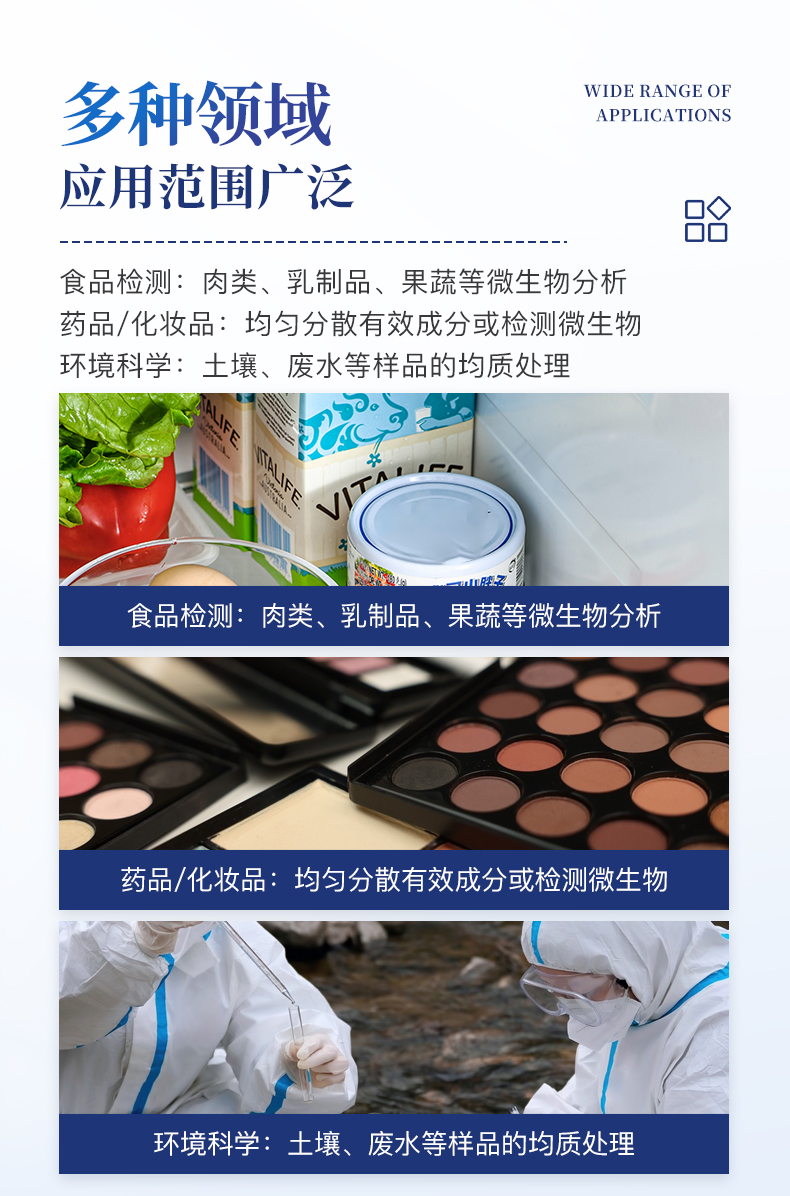 | 食品检测:肉类、乳制品、果蔬等微生物分析。 | 药品/化妆品:均匀分散有效成分或检测微生物。 | 环境科学:土壤、废水等样品的均质处理。 |