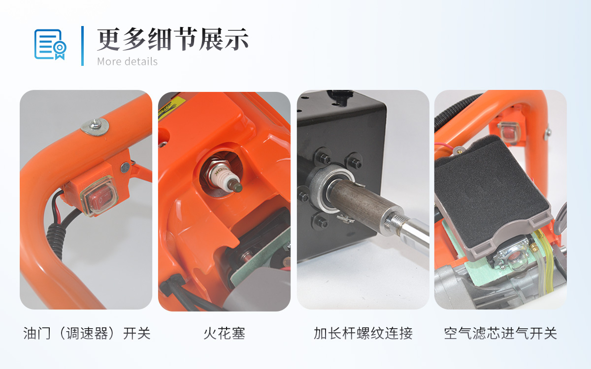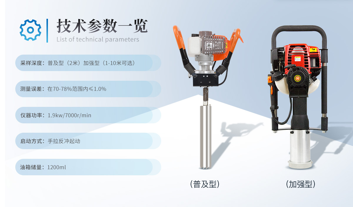 | 采样深度:1-10米(可选) | 振动频率:1300次/分钟 | 动力:1.6马力 (7000rpm) | 发动机类型:单缸二冲程发动机 | 油耗:不大于0.6L/h | 重量:20.2kg(主机) | 样品管规格:内外径不低于35mm/40mm;长度不低于1.00米/根 | 采样深度,可以连接钻杆一次性采样,中途不提钻 | 起拔装置:快速起拔,速度不低于3.00米/分钟 |