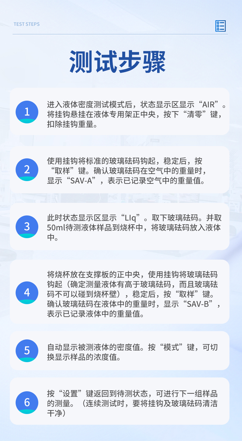 | 1、进入液体密度测试模式后,状态显示区显示“AIR”。 将挂钩悬挂在液体专用架正中央,按下“清零”键,扣除挂钩重量。 | 2、使用挂钩将标准的玻璃砝码钩起,稳定后,按“取样”键。确认玻璃砝码在空气中的重量时,显示“SAV-A”,表示已记录空气中的重量值。 | 3、此时状态显示区显示“LIq”。取下玻璃砝码。并取50ml待测液体样品到烧杯中,将玻璃砝码放入液体中。 | 4、将烧杯放在支撑板的正中央,使用挂钩将玻璃砝码钩起(确定测量液体有高于玻璃砝码,而且玻璃砝码不可以碰到烧杯壁),稳定后,按“取样”键。确认玻璃砝码在液体中的重量时,显示“SAV-B”,表示已记录液体中的重量值。 | 5、自动显示被测液体的密度值。按“模式”键,可切换显示样品的浓度值。 | 7、按“设置”键返回到待测状态,可进行下一组样品的测量。(连续测试时,要将挂钩及玻璃砝码清洁干净) | 仪器尺寸:195*220*190mm | 包装尺寸:430*200*360mm | 包装重量:4kg |