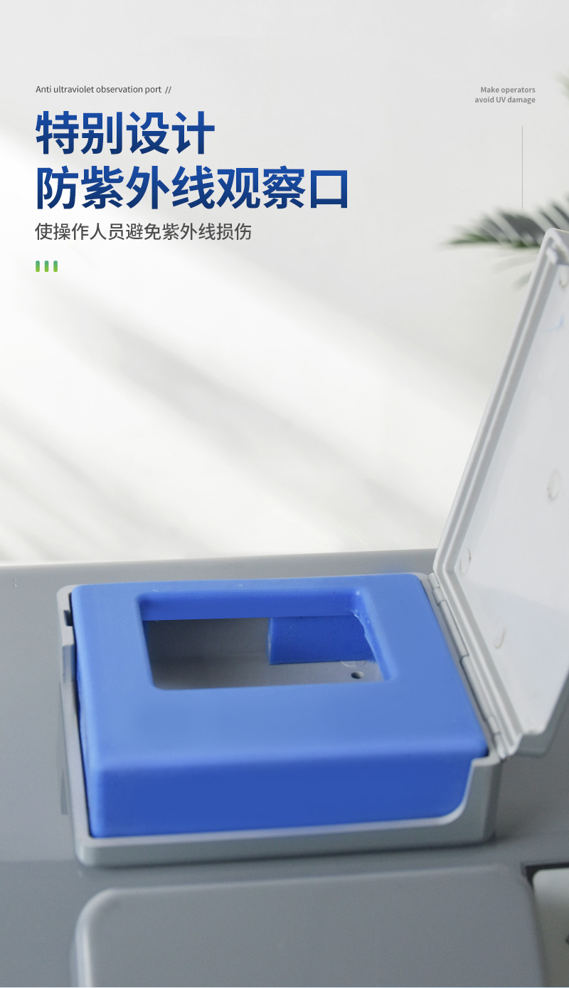 | 1、开机 1.1 使用220V交流电源,用专用电源将本仪器连接到220-240V/50-60Hz交流电源。 | 2、操作程序 | 2.1 接通电源,开机 | 2.2 打开检测室门,把待测样品放进检测室,关闭检测室门 | 2.3 在观察口中观察,分别是在可见光、365nm、254nm下依次进行检测。 | 2.4 检测完毕。再关机。 |