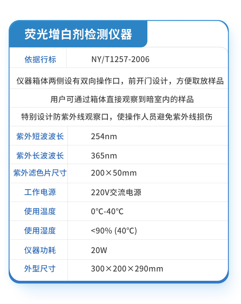 | ★依据行标:NY/T1257-2006 | ★仪器箱体两侧设有双向操作口,前开门设计,方便取放样品。 | ★用户可通过箱体直接观察到暗室内的样品。 | ★特别设计防紫外线观察口,使操作人员避免紫外线损伤。 | ★紫外短波波长:254nm | ★紫外长波波长:365nm | ★可见光源 | ★紫外滤色片尺寸:200×50mm | ★工作电源: 220V交流电源 | ★使用温度: 0℃-40℃ | ★使用湿度: <90% (40℃) | ★仪器功耗: 20W | ★外型尺寸:300×200×290mm |