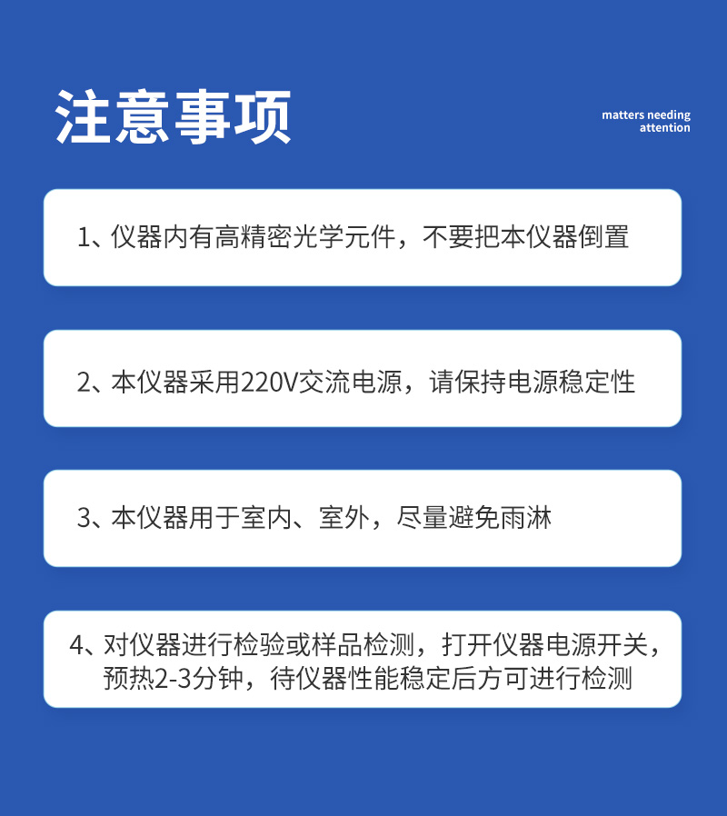 | 1. 仪器内有高精密光学元件,不要把本仪器倒置 | 2. 本仪器采用220V交流电源,请保持电源稳定性 | 3. 本仪器用于室内、室外,尽量避免雨淋 | 4. 对仪器进行检验或样品检测,打开仪器电源开关,需预热2-3分钟,待仪器性能稳定后方可进行检测 |