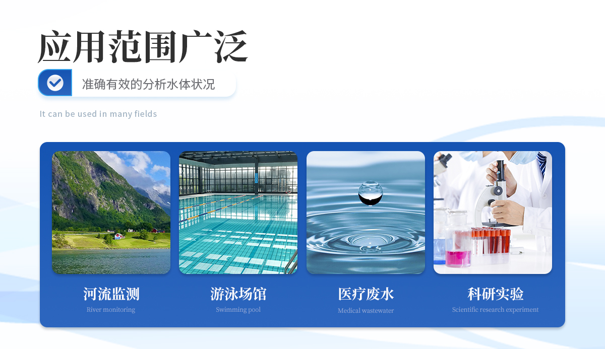 | 适用于饮用水、自来水、医疗废水、工业污水、河流监测、游泳场馆、水源?;ぁ⒖蒲惺笛榈?。 |