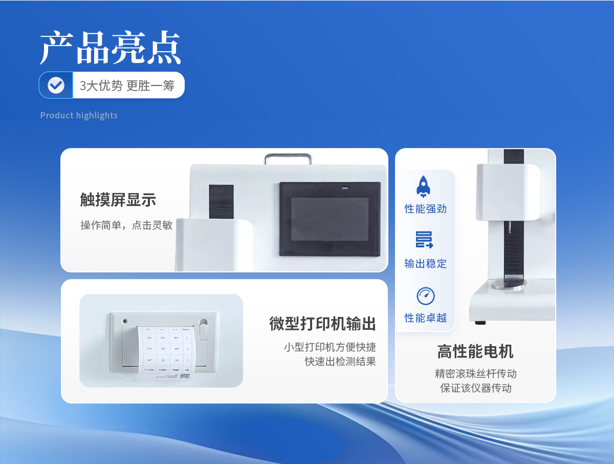 | 1、采用芯片控制,高精度测力传感器,精度高。 | 2、采用高性能电机,滚珠丝杆传动,保证该仪器传动。 | 3、大触摸屏中文显示,友好人机界面操作。全自动完成测试。操作方便,具有测试数据统计处理功能,微型打印机输出。 |