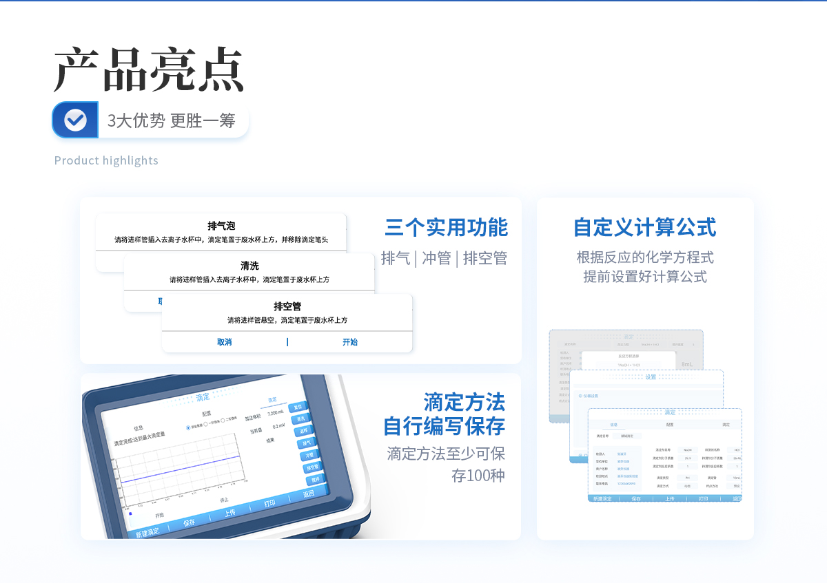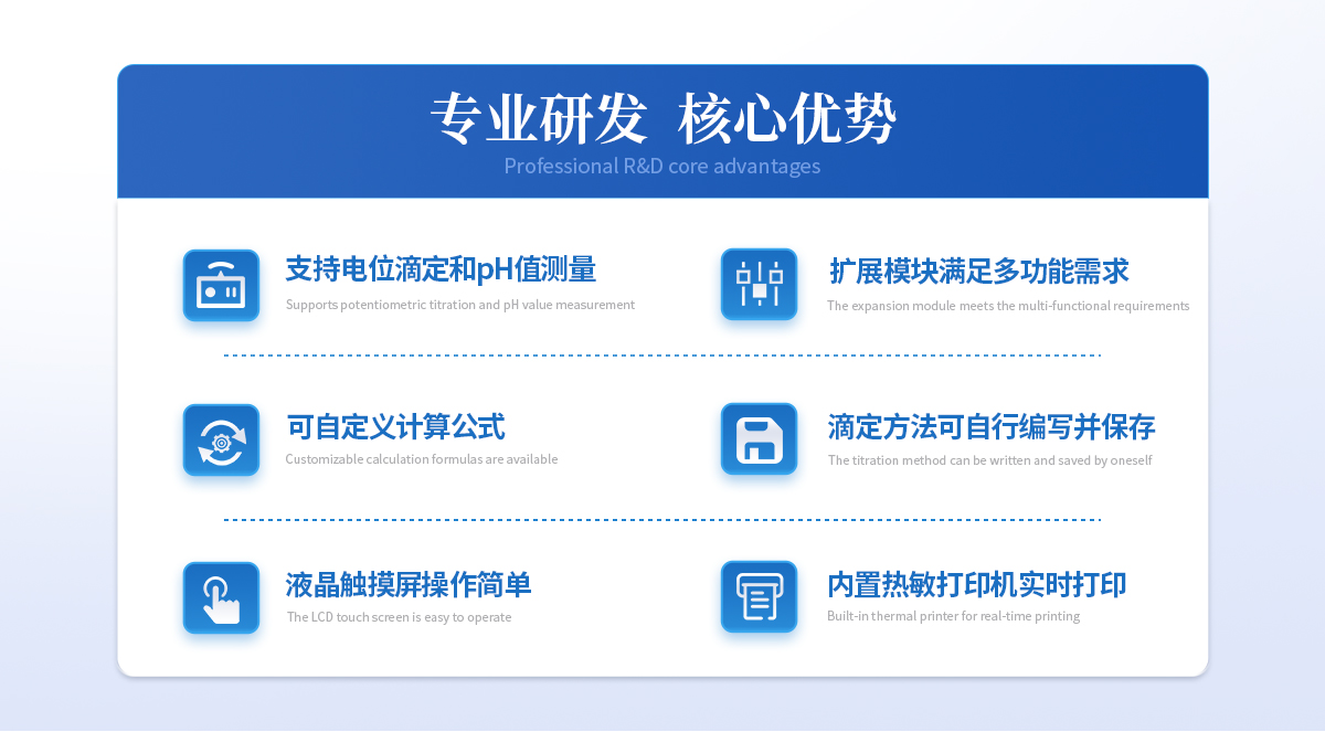 | 1、设备支持电位滴定和pH值测量;用户选择不同电极可进行酸碱滴定、氧化还原滴定、沉淀滴定、络合滴定等多种滴定和pH测量; | 2、用户可选配电导滴定、永停滴定等扩展模块,满足用户多功能需求; | 3、设备对****中采用的电位滴定法均满足,用户可根据检测需求选择适配的电极即可; | 4、支持动态滴定、等量滴定、手动滴定的滴定方式,可预设滴定终点或自动识别终点滴定,方便用户根据样品特性选择**滴定工作流程; | 5、可自定义计算公式,根据反应的化学方程式提前设置好计算公式,滴定完成后将自动获得待测物含量; | 6、滴定方法可自行编写并保存,形成滴定方法快捷模式,在使用时可直接选择运行,滴定方法至少可保存100种; | 7、设备可作为实验室常规手动滴定的滴定装置使用;计量泵替代滴定管,磁力搅拌功能替代手动摇晃锥形瓶的工作; |