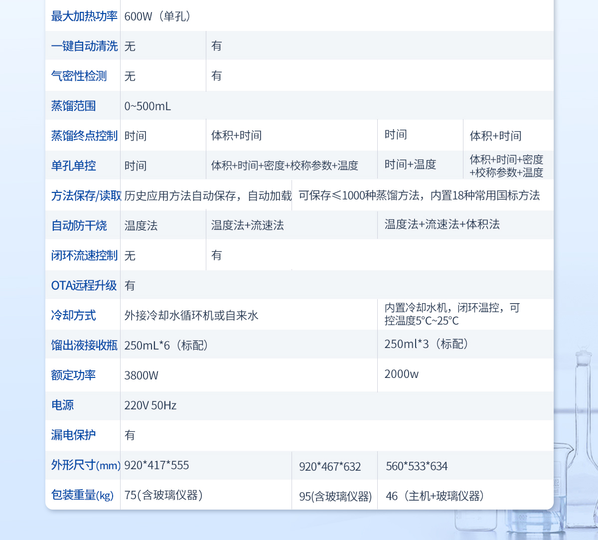 | 方法保存/读取 | 历史应用方法自动保存,自动加载 | 可保存≤1000种蒸馏方法,内置18种常用国标方法 | |