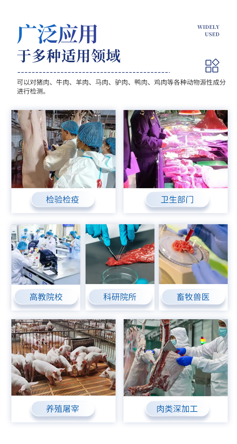 肉源性检测仪器是一款**、便捷的食品检测设备,专为识别肉类的真假而设计??梢远灾砣狻⑴H?、羊肉、马肉、驴肉、鸭肉、鸡肉等各种动物源性成分进行检测。能够迅速、准确地检测肉类及肉源性样品中的DNA成分,确保所食用的肉类真实可靠。其高灵敏度和低误差率确保了检测结果的准确性,为各检测单位提供专业的检测服务。