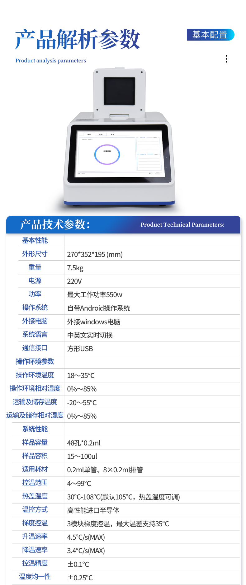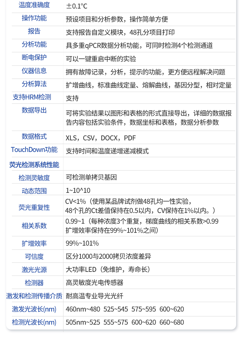 | 基本性能 | 外形尺寸:270*352*195 (mm) | 重量:7.5kg | 电源:220V | 功率:**工作功率550w | 操作系统:自带Android操作系统 | 外接电脑:外接windows电脑(win7系统以上) | 系统语言:中英文实时切换 | 通信接口:方形USB | 操作环境参数 | 操作环境温度:18~35℃ | 操作环境相对湿度:0%~85% | 运输及储存温度:-20~55℃ | 运输及储存相对湿度:0%~85% | 系统性能 | 样品容量:48孔*0.2ml | 样品容积:15~100ul | 适用耗材:0.2ml单管、8×0.2ml排管 | 控温范围:4~99℃ | 热盖温度:30℃-108℃(默认105℃,热盖温度可调) | 温控方式:高性能进口半导体 | 梯度控温:3??樘荻瓤匚拢?*温差支持35℃ | 升温速率:4.5℃/s(MAX) | 降温速率:3.4℃/s(MAX) | 控温精度:±0.1℃ | 温度均一性:±0.25℃ | 温度准确度:±0.1℃ | 操作功能:预设项目和分析参数,操作简单方便 | 报告:支持报告自定义模块,48孔分项目打印 | 分析功能:具多重qPCR数据分析功能,可同时检测4个检测通道 | 断电保护:可以一键重启中断的实验 | 仪器信息:拥有故障记录,分析,提示的功能,更方便远程解决问题 | 分析算法:扩增曲线,标准曲线定量、熔解曲线,基因分型(SNP),相对定量 | 支持HRM检测:支持 | 数据导出:可将实验结果以图形和表格的形式直接导出;详细的数据报告内容包括实验条件,数据坐标和表格,数据分析参数。 | 数据格式:XLS, CSV, DOCX,PDF | TouchDown功能:支持时间和温度递增递减模式 | 荧光检测系统性能 | 检测灵敏度:可检测单拷贝基因 | 动态范围:1~10^10 | 荧光重复性:CV<1%(使用某品牌试剂做48孔均一性实验,48个孔的Ct差值保持在0.5以内,CV保持在1%以内。) | 相关系数:0.99~1(每种浓度3个重复,梯度曲线的相关系数>0.99,扩增效率保持在99%~101%之间) | 扩增效率:99%~101% | 可信度:区分1000与2000拷贝浓度差异 | 激光光源:大功率LED(免维护,寿命长) | 检测器:高灵敏度光电传感器 | 激发和检测传播介质:耐高温专业导光光纤 | 激发光波长:460nm~480nm , 525nm~545nm, 575nm~595nm ,600nm~620nm | 检测光波长:505nm~525nm , 555nm~575nm , 600nm~620nm , 660nm~680nm |