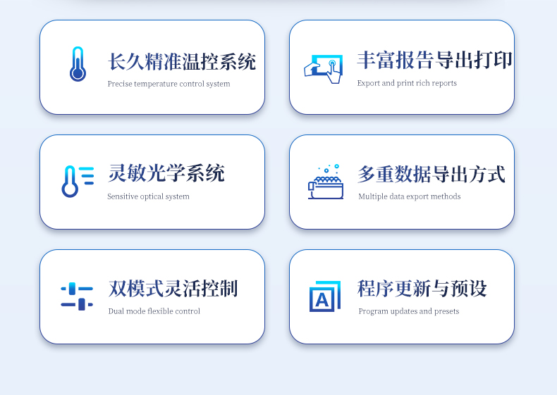 | 1.采用高规格铝合金样品槽,热导性好,耐腐蚀抗氧化,Peltier加热控温,全面的密封设计。无论是样品溶液还是冷凝水,都不会渗漏到样品槽下面的帕尔帖控温元件以及其他电子元件,可有效延长仪器的使用寿命。 | 2.采用高精度PT1000温度传感器,控温精度达到0.01℃,充分保证控温的准确度。 | 3.样品通量:0.2ml单管、0.2ml八联管。 | 4.开放的试剂耗材系统:可以选任何品牌的试剂,适用于标准的8联管或0.2ml PCR单管 | 5.采用蓝色、绿色、红色和黄色四个高强度宽光谱长寿命LED固态光源,确保在整个光谱检测范围内都有很强的光强,提高检测灵敏度,而且不发热,使用寿命长,终身免维护。 | 6.高灵敏度检测器:采用日本进口的高灵敏度的光电倍增管,检测灵敏度更高。 | 7.无需光路校正:扫描系统能确保每孔的信号激发和检测光程都完全一致,无需光路校正,因此无需额外占用一个校正通道,可以实现真正的四通道基因检测?!?/td> | 8.通道数:配置4通道。 | 9.通道串扰:采用高精度窄波带滤光片,极大程度减少通道串扰,软件也可以修正串扰参数。 | 10.检测灵敏度:能检测到单拷贝DNA模板,能清晰区分1000拷贝和2000拷贝的质粒DNA | 11.线性检测范围:10个数量级★ | 12.支持常用荧光染料和探针检测方法,如SYBR Green I,Eva Green,Taqman,FRET,Molecular Beacons,Scorpions,Amplifluor等 | 13.模块温度范围:4-99℃ | 14.操控模式:系统屏幕自带的PCR操作系统或Windows电脑★ | 15.接口:电脑USB连接 | 16.工作噪音:静音技术,运行时**的工作噪音不超过60 dB | 17.操作分析软件 | 17.1可以在运行程序后在定义样品孔,节省实验时间 | 17.2运行程序时可以同时打开其他实验数据结果进行查阅分析 | 17.3软件自动计算基线范围和自动设置阈值线,给用户提供可靠准确的数据结果 | 17.4实验程序设置信息和检测结果可直接打印成实验报告,支持XLS,CSV,WORD等多种文件格式和数据样式导出★ | 17.5同一批实验的结果可以分组进行独立的数据分析,*多可分成2个组 | 17.6提供中英文软件界面?!?/td> | 17.7软件可以无限制安装在多台电脑上,无需付费购买使用权,终身可免费升级。 |