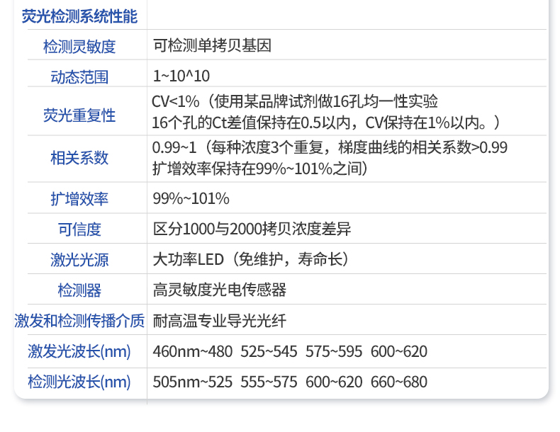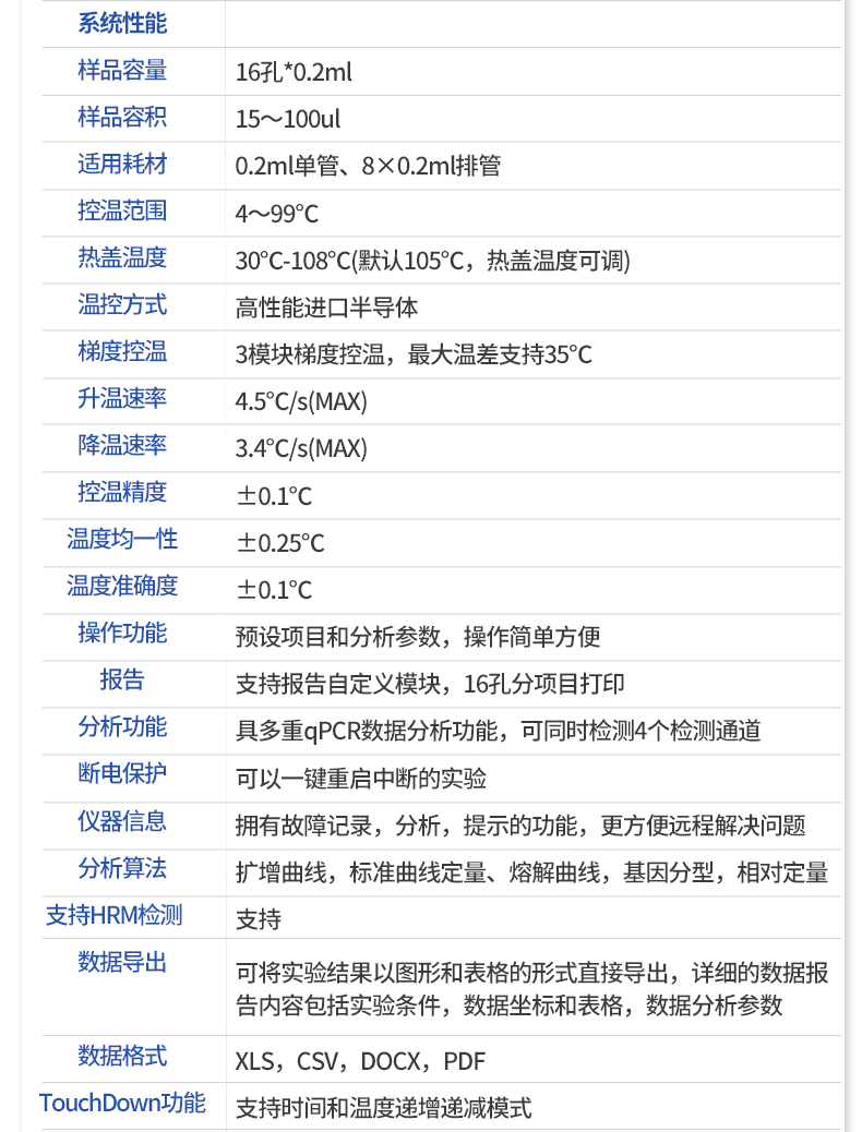 | 基本性能 | 外形尺寸:270*352*195 (mm) | 重量:7.1kg | 电源:220V | 功率:**工作功率300w | 操作系统:自带Android操作系统 | 外接电脑:外接windows电脑(win7系统以上) | 系统语言:中英文实时切换 | 通信接口:方形USB | 操作环境参数 | 操作环境温度:18~35℃ | 操作环境相对湿度:0%~85% | 运输及储存温度:-20~55℃ | 运输及储存相对湿度:0%~85% | 系统性能 | 样品容量:16孔*0.2ml | 样品容积:15~100ul | 适用耗材:0.2ml单管、8×0.2ml排管 | 控温范围:4~99℃ | 热盖温度:30℃-108℃(默认105℃,热盖温度可调) | 温控方式:高性能进口半导体 | 梯度控温:3??樘荻瓤匚?,**温差支持35℃ | 升温速率:4.5℃/s(MAX) | 降温速率:3.4℃/s(MAX) | 控温精度:±0.1℃ | 温度均一性:±0.25℃ | 温度准确度:±0.1℃ | 操作功能:预设项目和分析参数,操作简单方便 | 报告:支持报告自定义???,16孔分项目打印 | 分析功能:具多重qPCR数据分析功能,可同时检测4个检测通道 | 断电?;ぃ嚎梢砸患仄糁卸系氖笛?/td> | 仪器信息:拥有故障记录,分析,提示的功能,更方便远程解决问题 | 分析算法:扩增曲线,标准曲线定量、熔解曲线,基因分型(SNP),相对定量 | 支持HRM检测:支持 | 数据导出:可将实验结果以图形和表格的形式直接导出;详细的数据报告内容包括实验条件,数据坐标和表格,数据分析参数。 | 数据格式:XLS, CSV, DOCX,PDF | TouchDown功能:支持时间和温度递增递减模式 | 荧光检测系统性能 | 检测灵敏度:可检测单拷贝基因 | 动态范围:1~10^10 | 荧光重复性:CV<1%(使用某品牌试剂做16孔均一性实验,16个孔的ct差值保持在0.5以内,cv保持在1%以内。)> | 相关系数:0.99~1(每种浓度3个重复,梯度曲线的相关系数>0.99,扩增效率保持在99%~101%之间) | 扩增效率:99%~101% | 可信度:区分1000与2000拷贝浓度差异 | 激光光源:大功率LED(免维护,寿命长) | 检测器:高灵敏度光电传感器 | 激发和检测传播介质:耐高温专业导光光纤 | 激发光波长:460nm~480nm , 525nm~545nm, 575nm~595nm ,600nm~620nm | 检测光波长:505nm~525nm , 555nm~575nm , 600nm~620nm , 660nm~680nm |